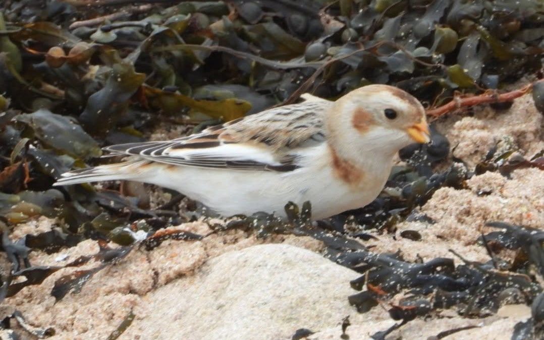 12 Pied Wagtail feeding along the high tide strandline of the beaches. I was heading around the coast towards Longis Baye when a message came through from Chris Tardivel, a visiting ringer, he had found a Snow Bunting on the beach!